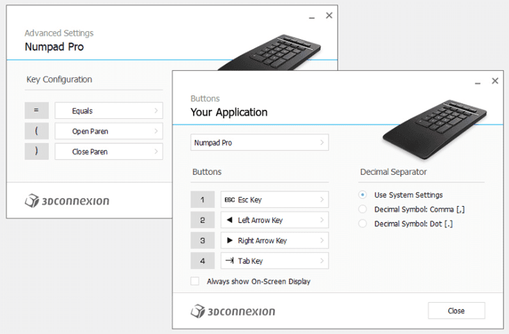 Het 3Dconnexion Numpad Pro is uitgerust met vier extra programmeerbare toetsen bovenop de standaard toetsenindeling. Dit slimme toetsenbord detecteert direct de software die je gebruikt en de bijbehorende context. De meest gebruikte commando’s worden automatisch gekoppeld aan deze toetsen voor snelle toegang. Daarnaast kun je de 3Dconnexion-toetsen moeiteloos instellen naar je eigen voorkeuren. Een schermoverlay toont je te allen tijde welke functies aan de toetsen zijn toegekend.